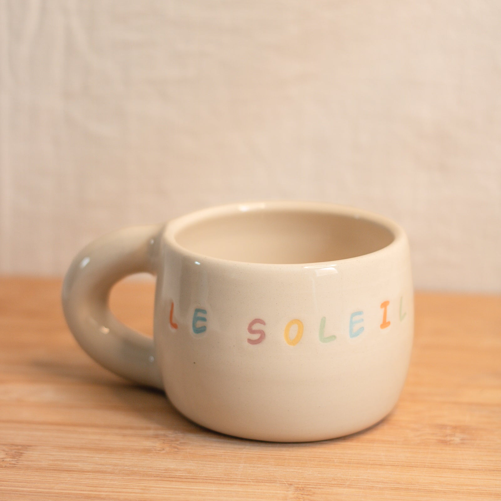 Les mugs sont tournés au tour de potier. Chaque lettre est apposée une à une et ensuite, peinte au pinceau. Les couleurs sont déposées de façon aléatoire et harmonieuse.