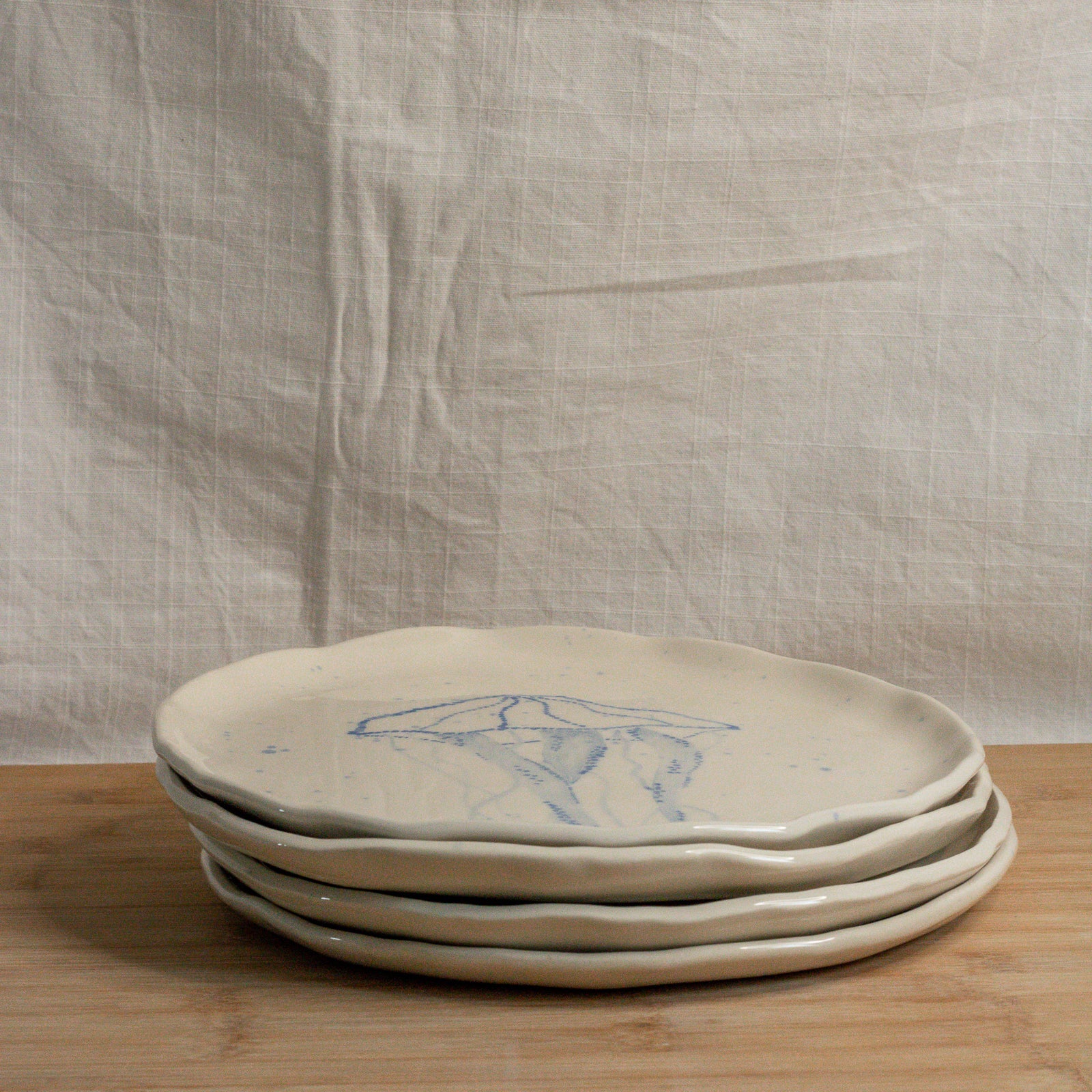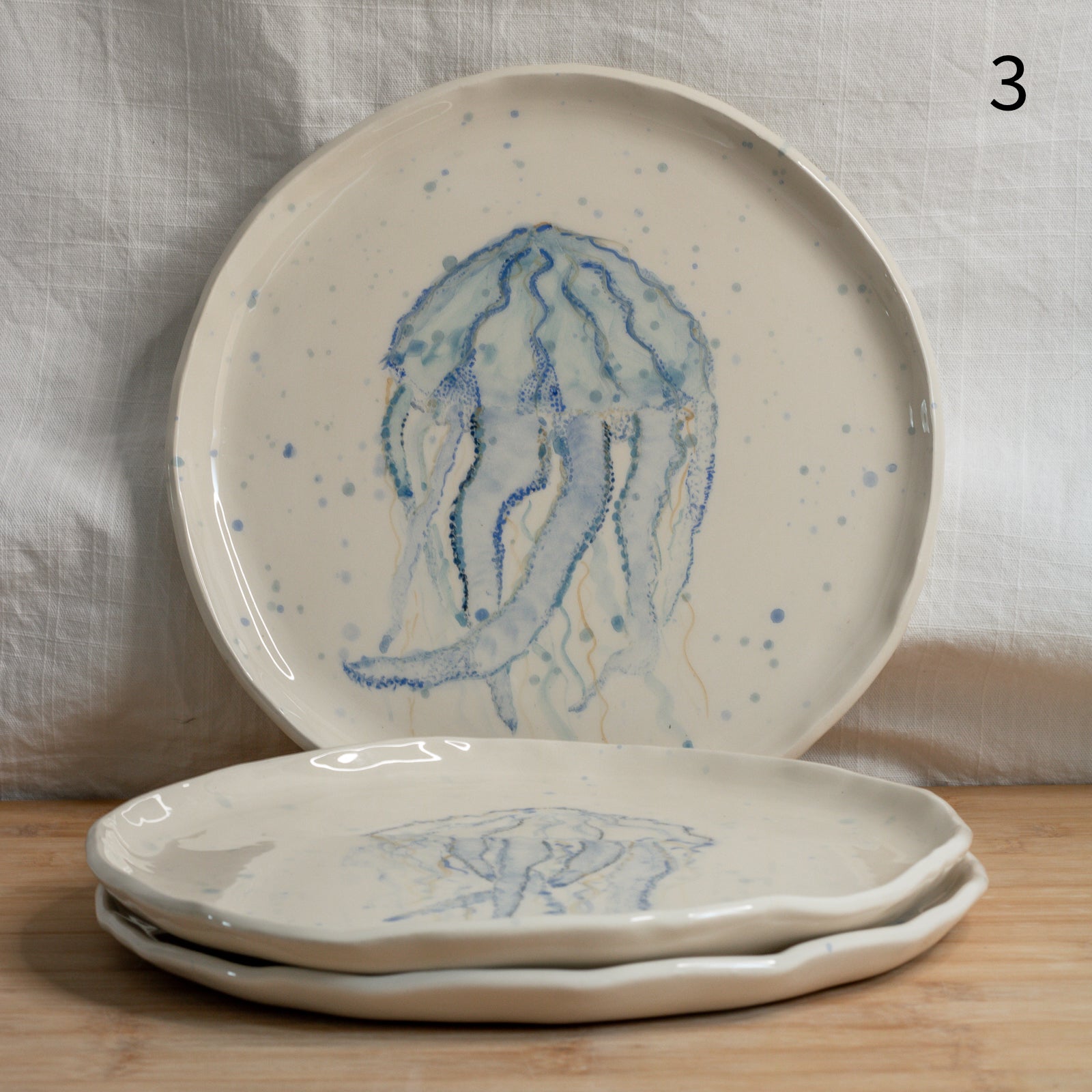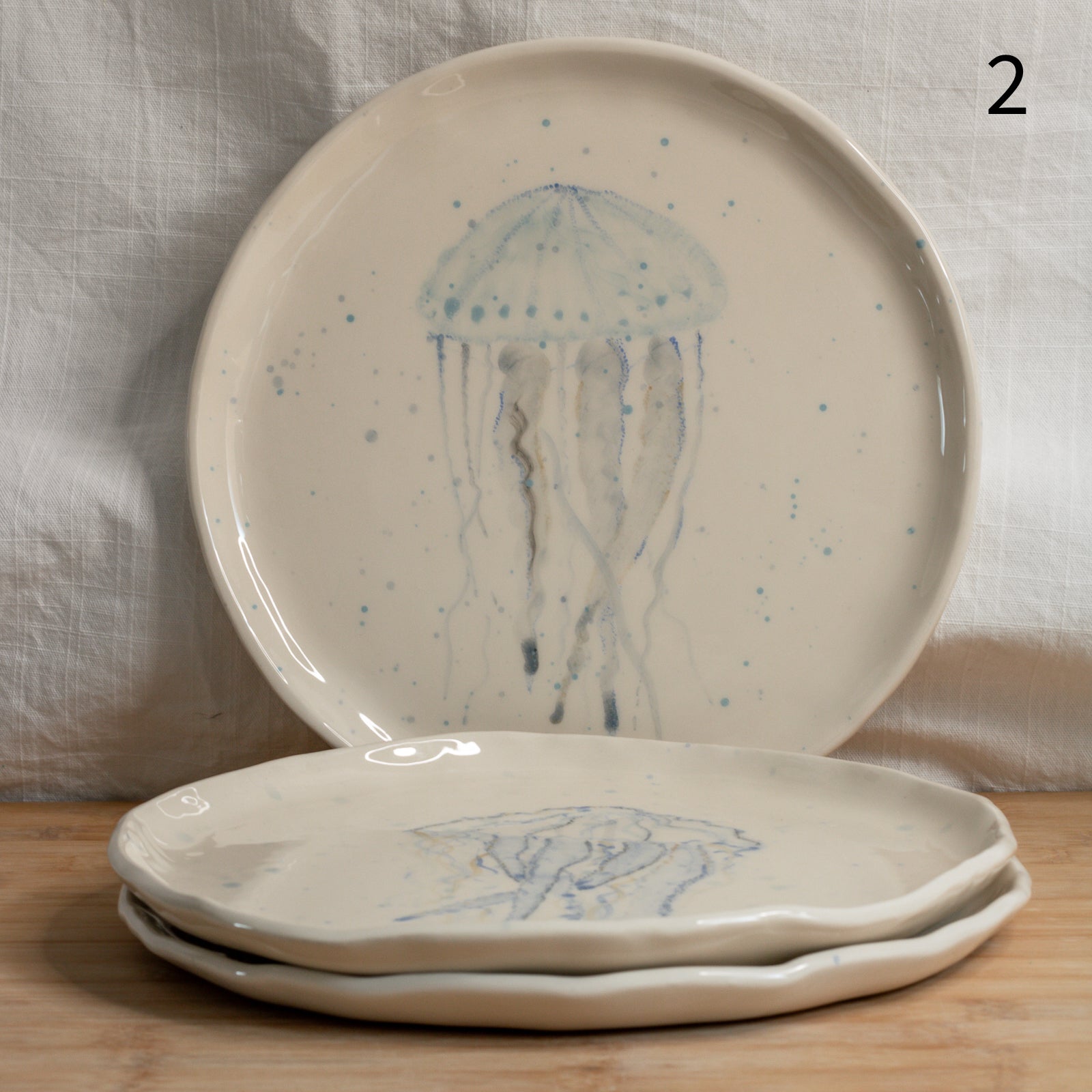 L'assiette Méduse est façonnée avec la technique de la plaque puis modelée à la main. Elle est ensuite décorée au pinceau avant la 1ère cuisson, puis émaillée.